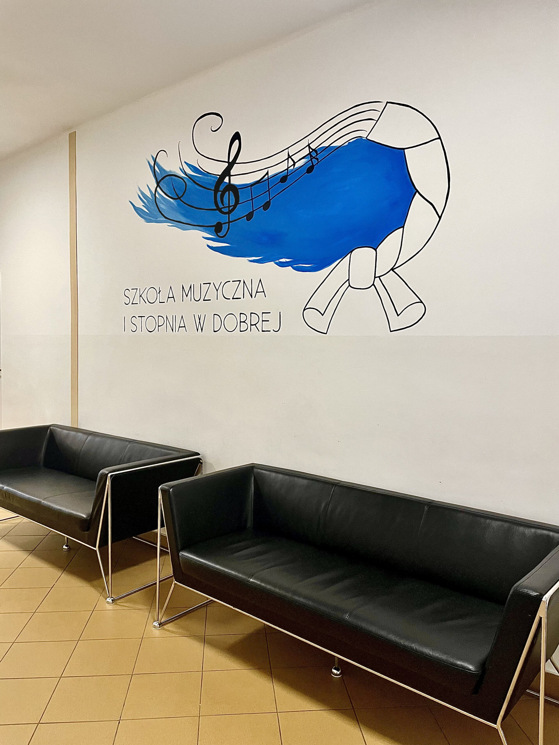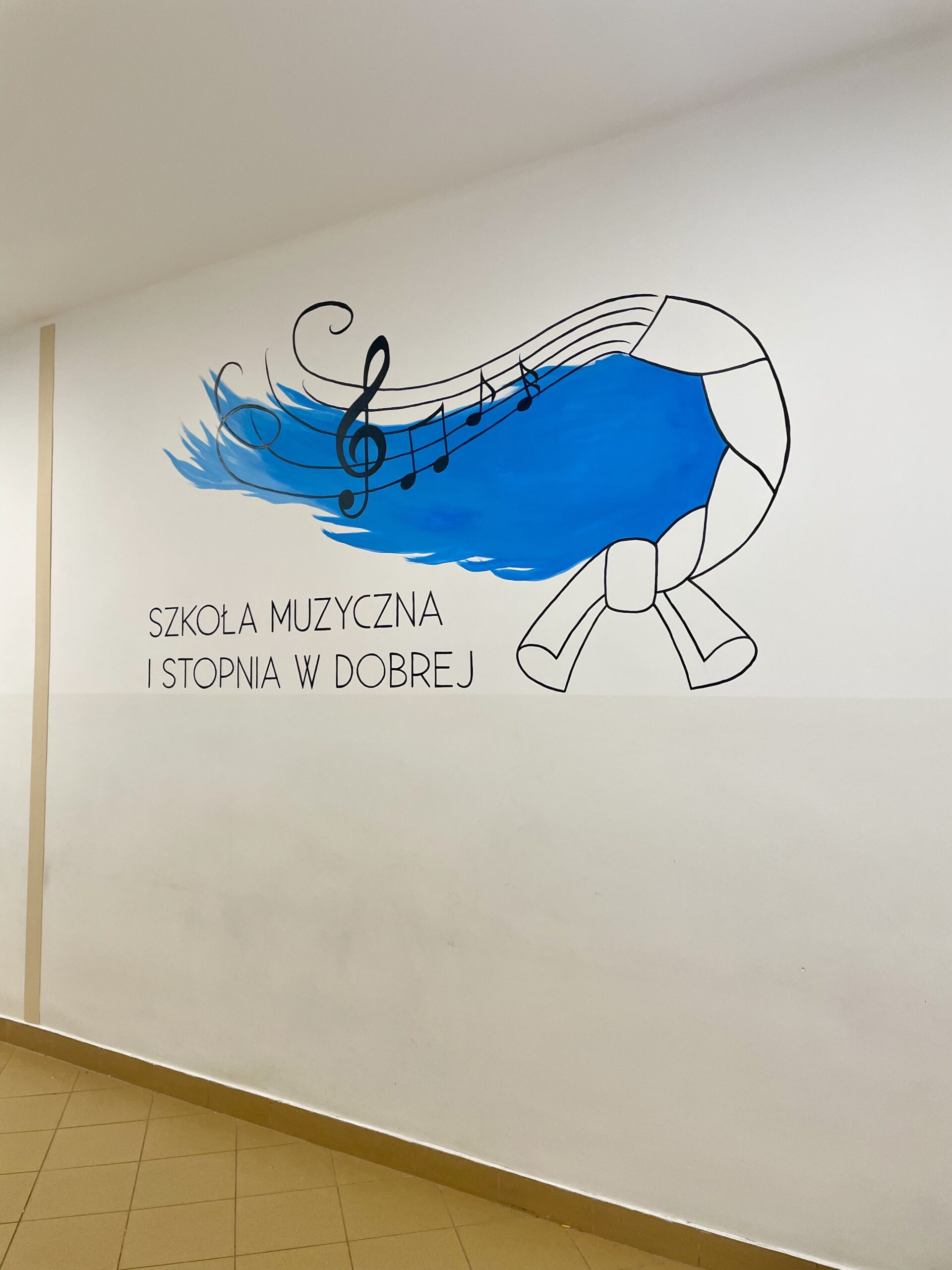 Na zlecenie Szkoły Muzycznej w miejscowości Dobra wykonano logo na ścianie wewnątrz siedziby szkoły.
