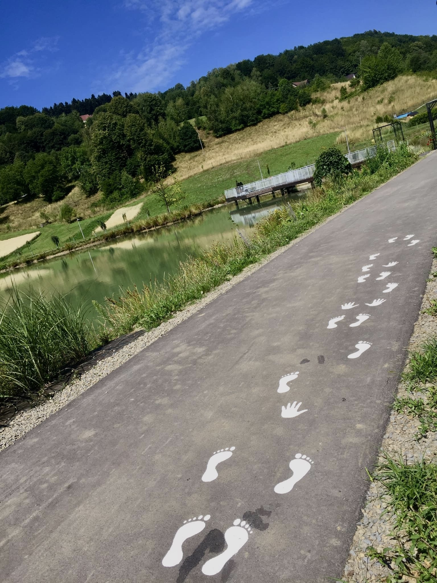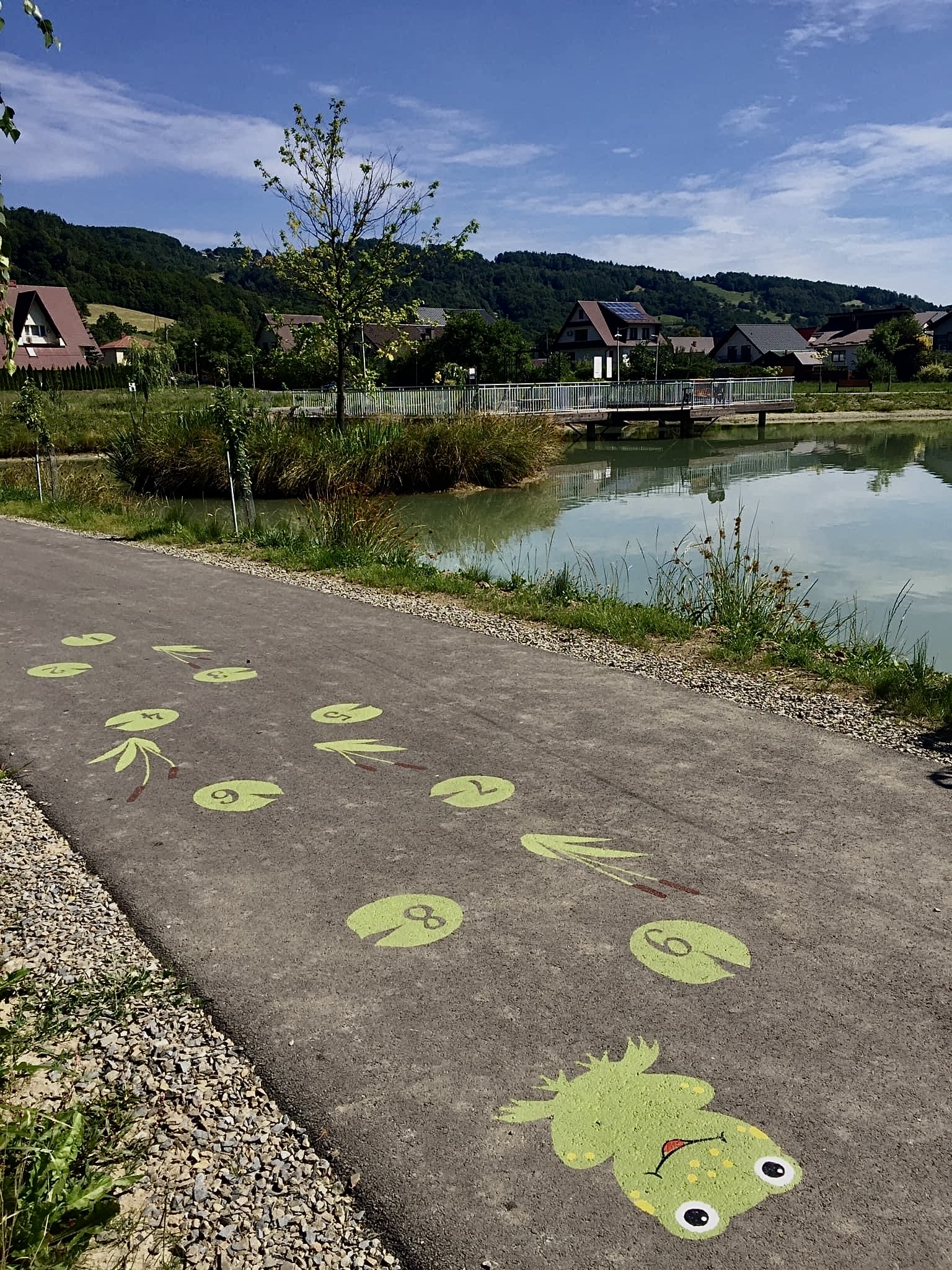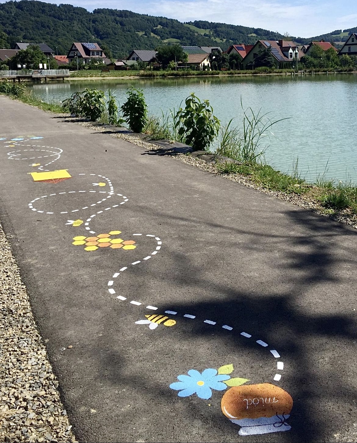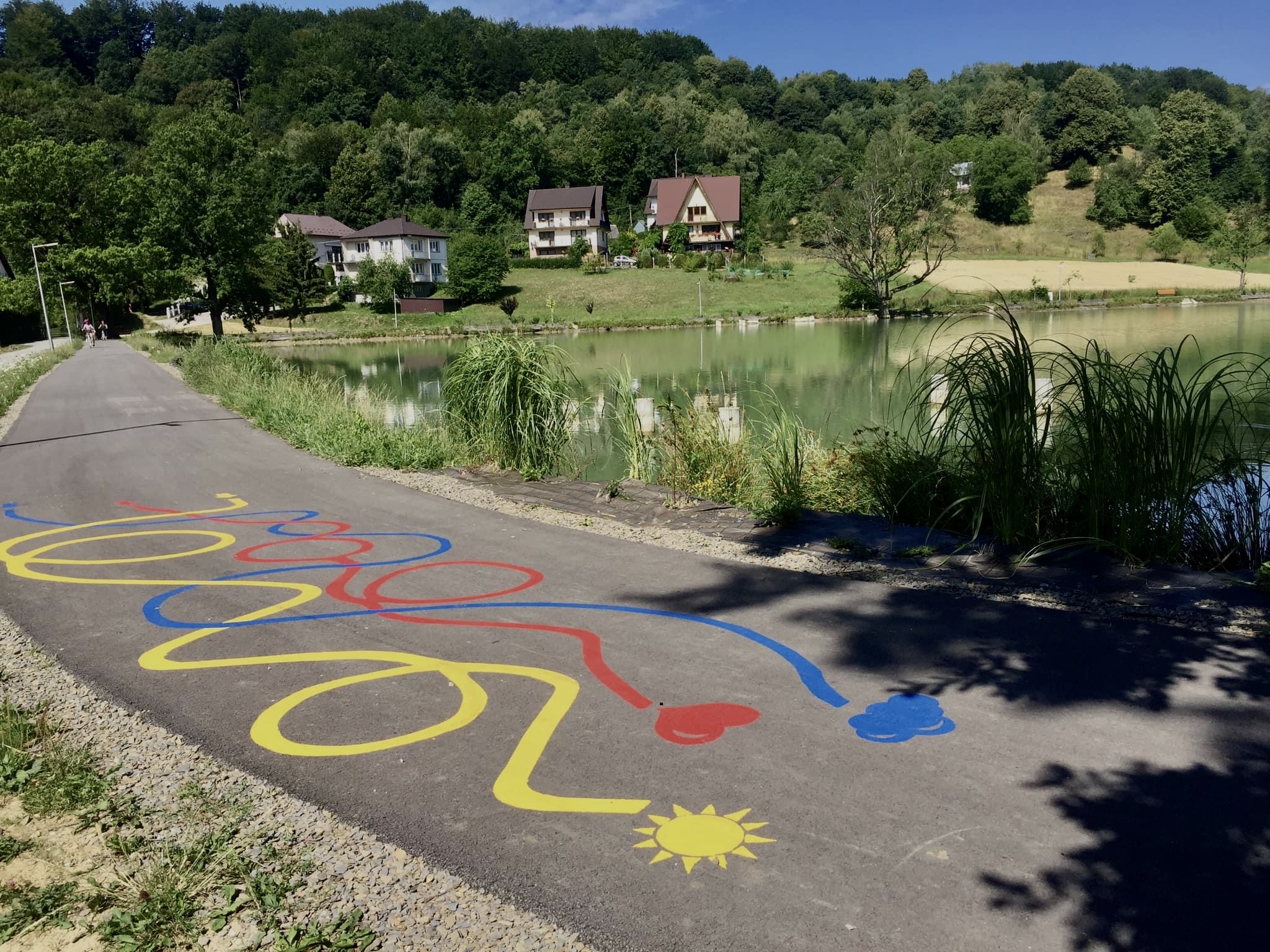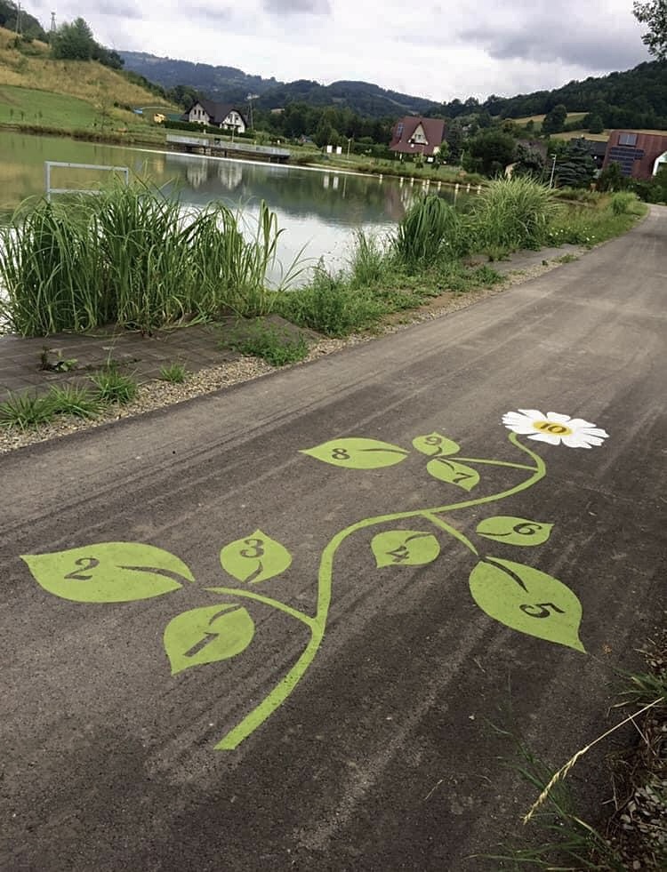 – realizacja polegała na zaprojektowaniu oraz namalowaniu na nawierzchni bitumicznej biegnącej wokół stawu, sześciu rodzajów gier nawierzchniowych. Farby użyte do realizacji projektu to specjalistyczne farby drogowe które zapewniają trwałość oraz łatwość w utrzymaniu czystości.