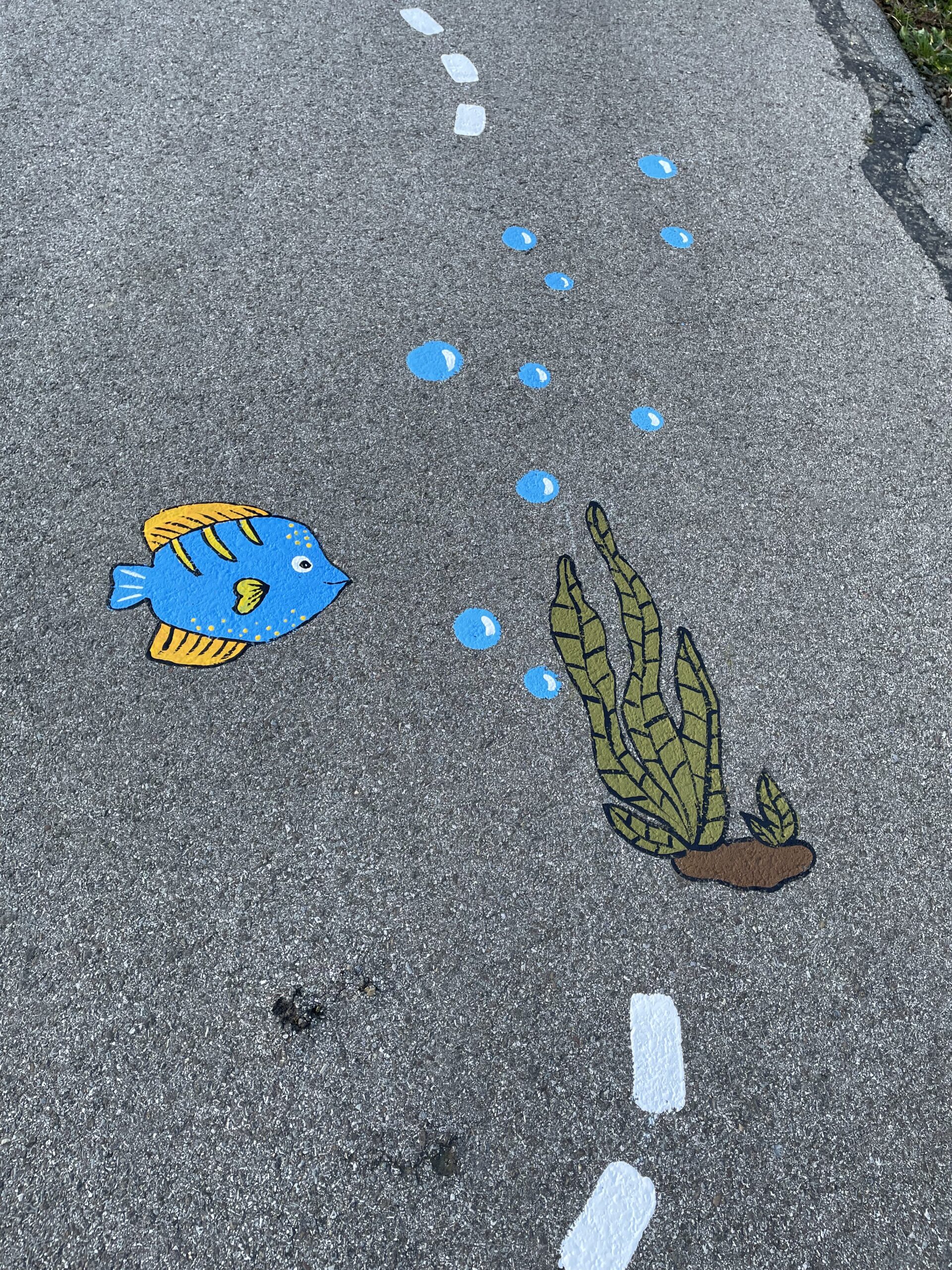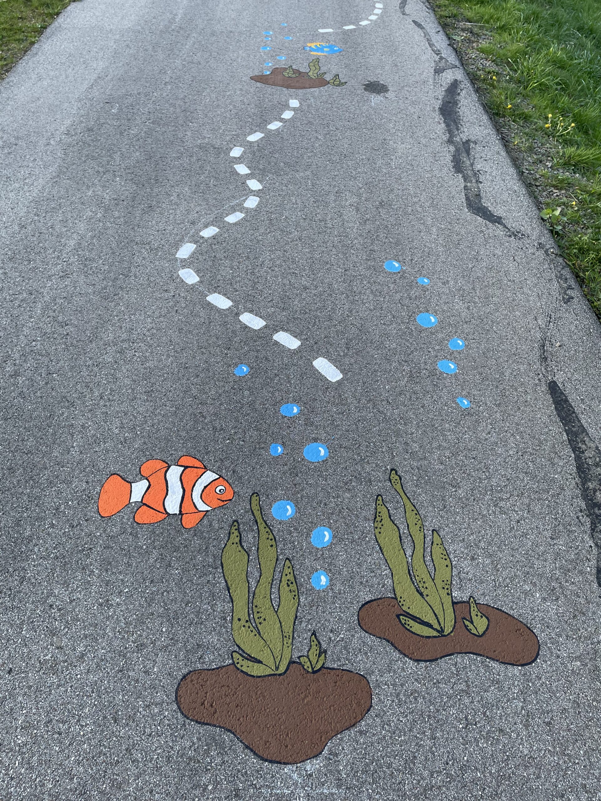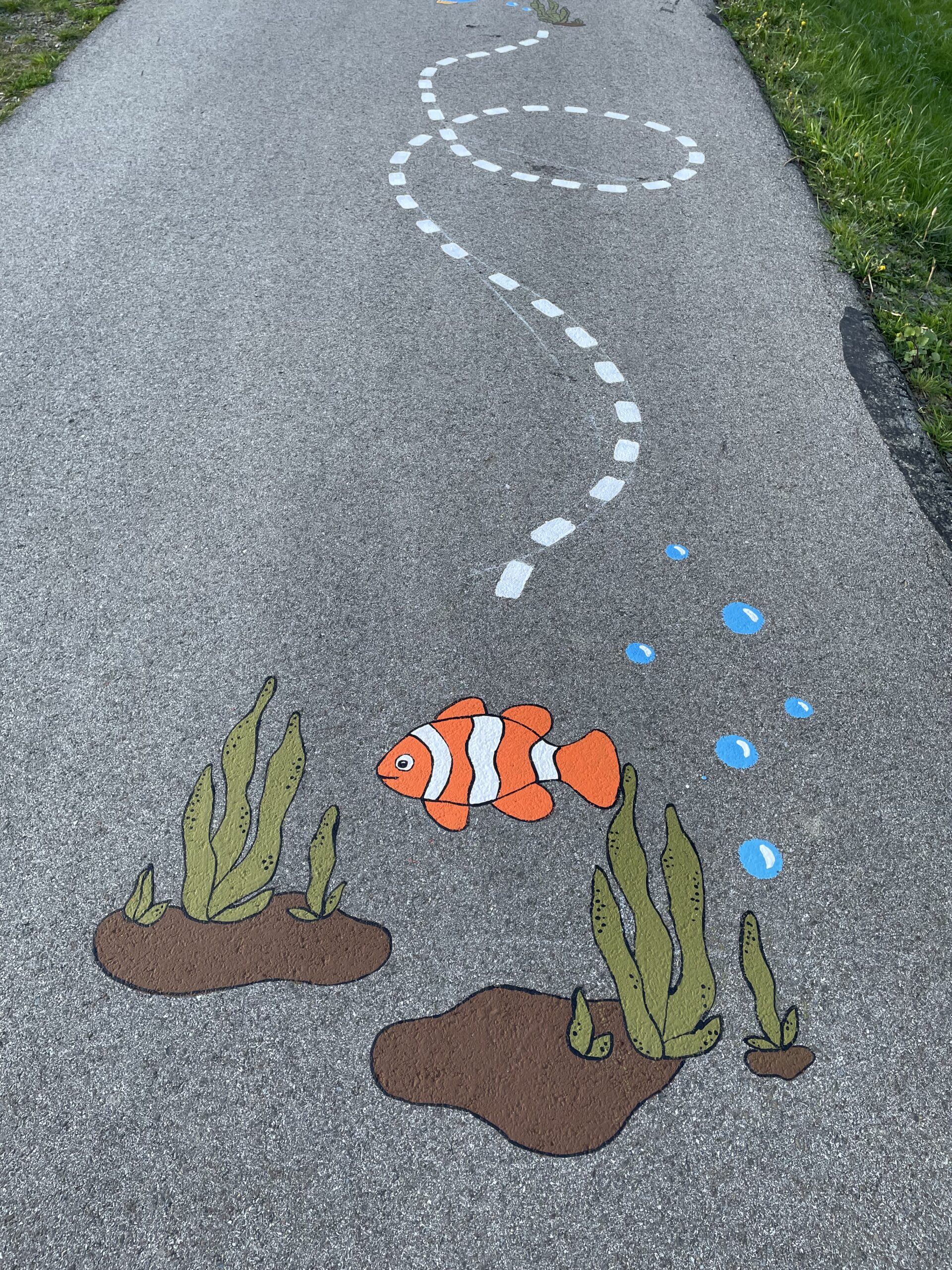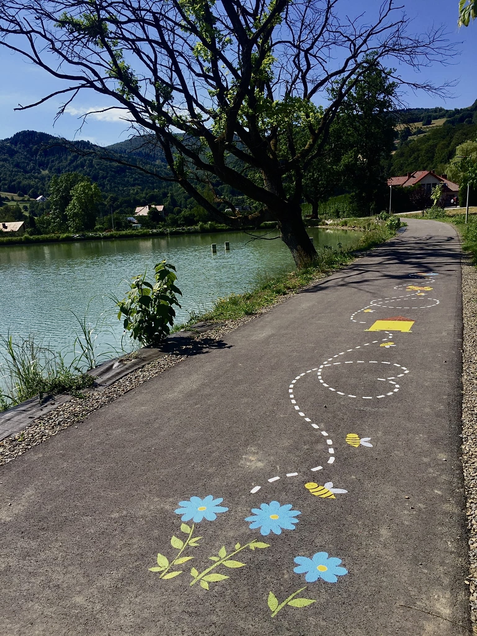 – realizacja polegała na zaprojektowaniu oraz namalowaniu na nawierzchni bitumicznej biegnącej wokół stawu, sześciu rodzajów gier nawierzchniowych. Farby użyte do realizacji projektu to specjalistyczne farby drogowe które zapewniają trwałość oraz łatwość w utrzymaniu czystości.